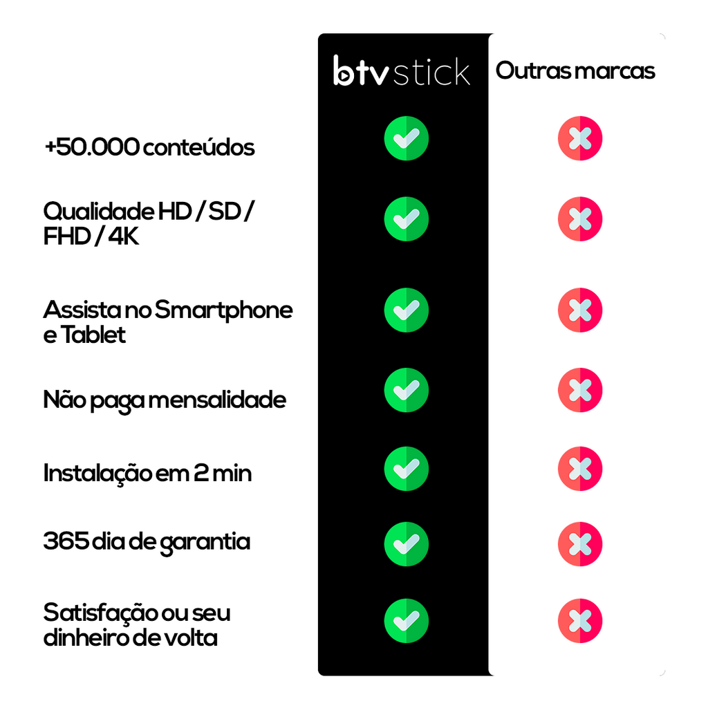Com o BTV Stick ES15, você desfruta de mais de 300 canais de TV ao vivo, incluindo esportes, filmes, séries, shows, notícias nacionais e internacionais, além de uma programação infantil completa para toda a família. Tudo isso sem antenas, sem cabos e sem mensalidades, utilizando apenas conexão Wi-Fi.